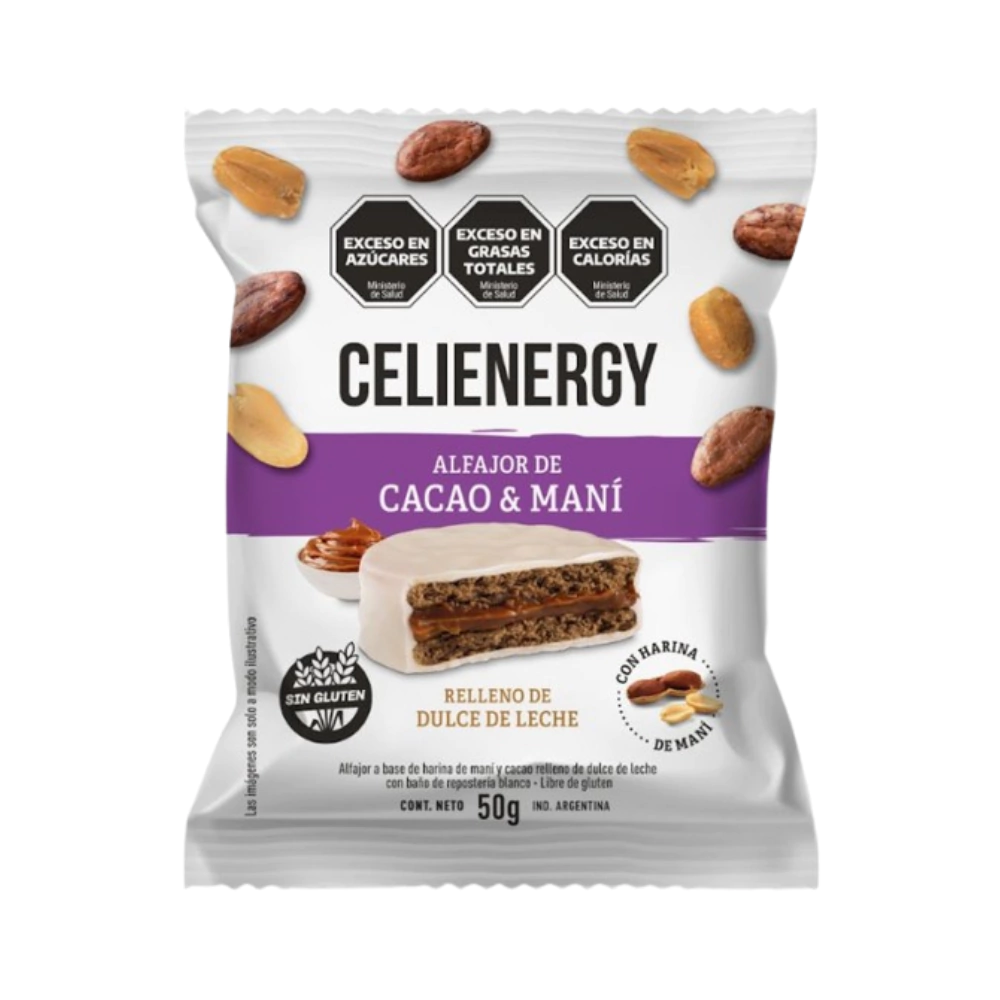 Alfajor de cacao y mani x 50g - Celienergy, combinacion energetica y sabrosa sin gluten, ideal para colaciones saludables.