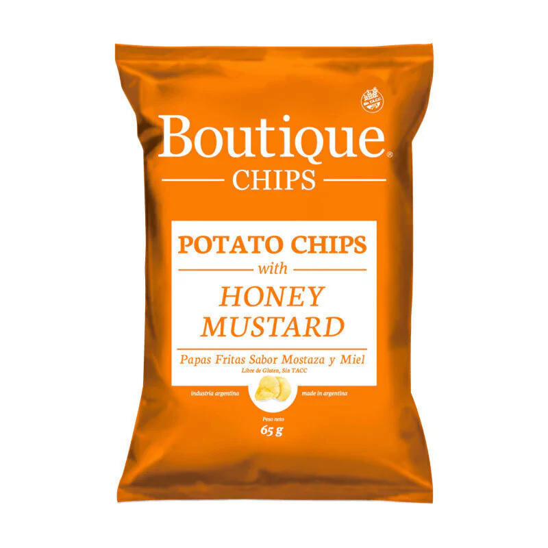 Chips de papas sabor mostaza y miel, una opcion crujiente y sabrosa para acompanar tus comidas o como snack.