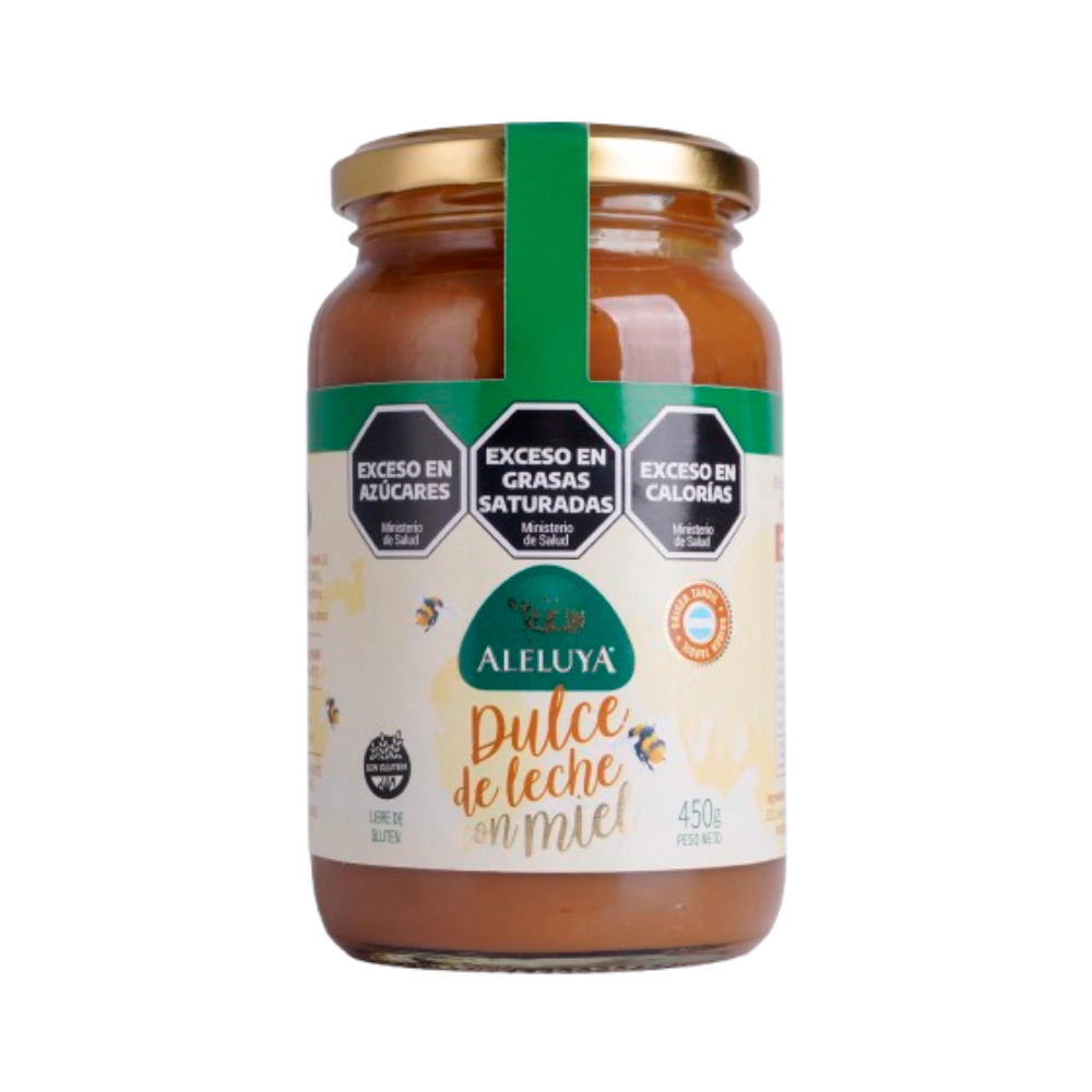 Dulce de leche con miel Aleluya 450g. Combinacion suave y cremosa con toque natural de miel. Ideal para untar o acompanar postres.