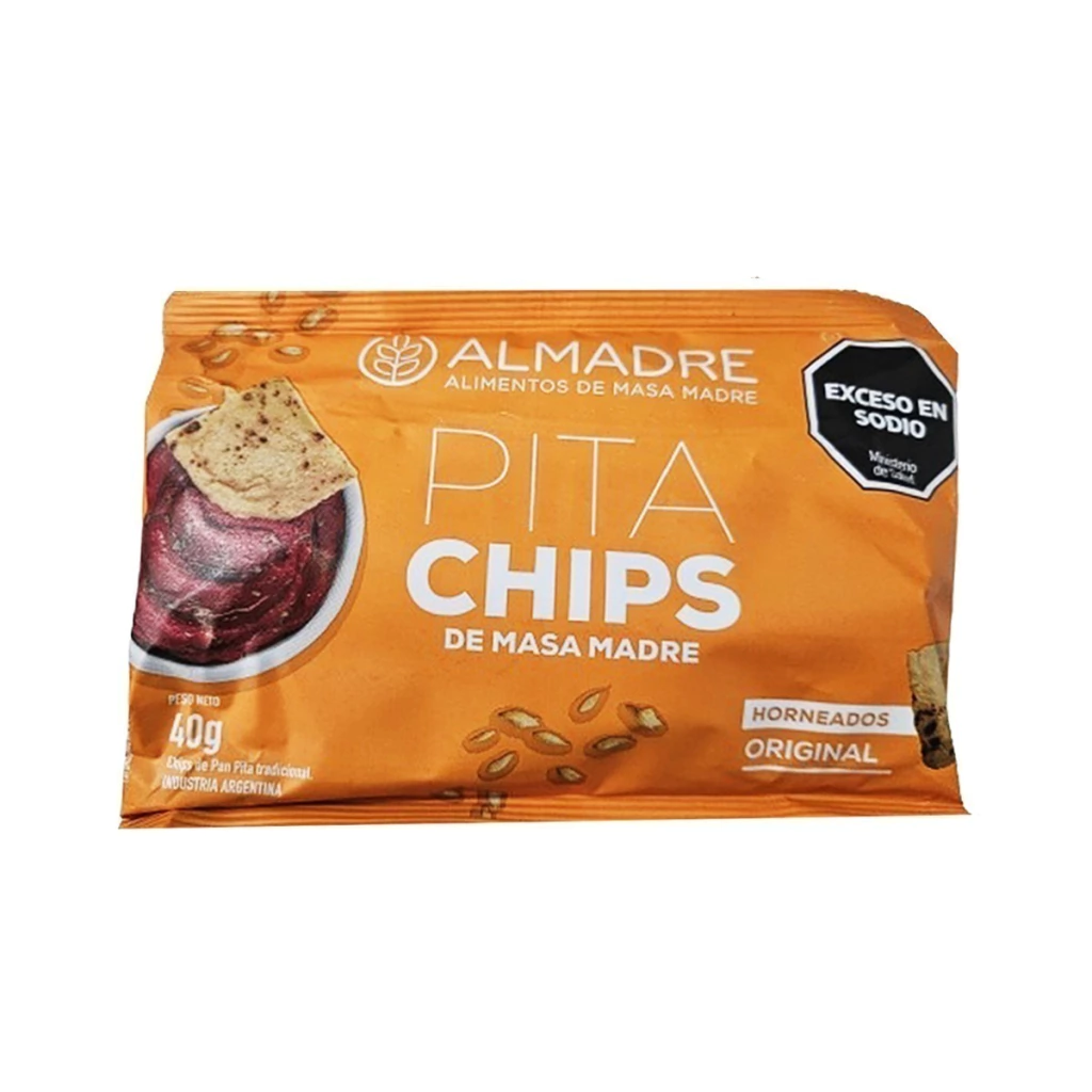 Pita chips de masa madre original de 40g, una opcion crujiente y deliciosa perfecta para acompanhar hummus y otros dips.