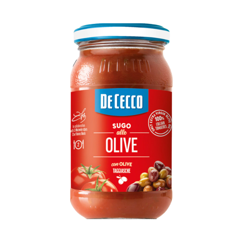 Salsa oliva siciliana De Cecco 200g. Salsa de tomate con aceitunas y condimentos mediterraneos, sabor intenso y equilibrado.